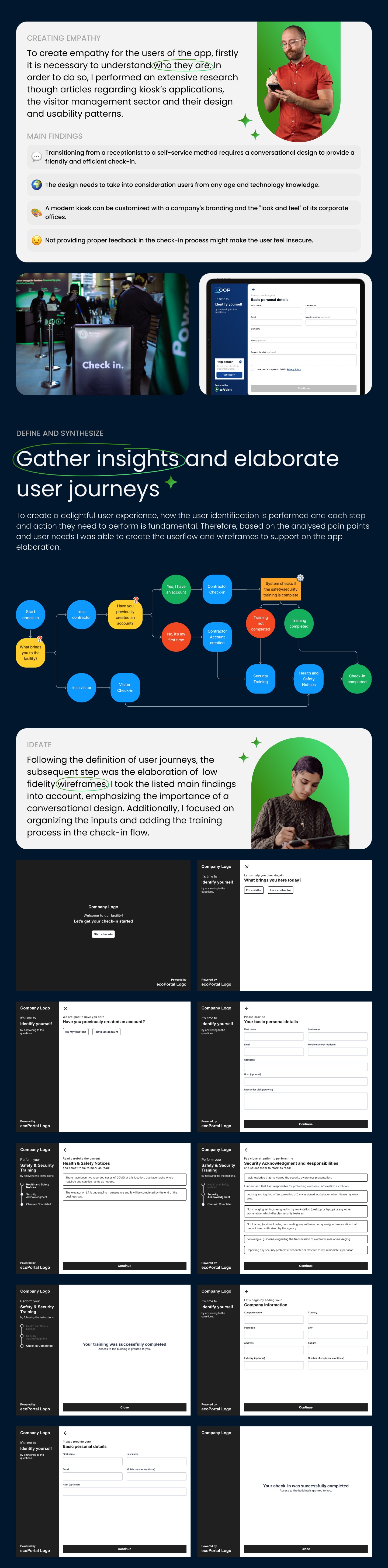 To create empathy for the users of the app, firstly it is necessary to understand who they are. In order to do so, I performed an extensive research though articles regarding kiosk’s applications, the visitor management sector and their design and usability patterns.
